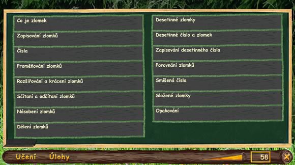 UČENÍ je první část programu. Je rozdělena do 15 kapitol, každá z nich obsahuje několik animovaných klipů, které vysvětlují vlastnosti zlomků a počítání s nimi.
